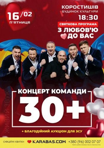 У п’ятницю, 16 лютого, в Коростишівському Будинку культури відбудеться концерт команди “30+” з святковою програмою “З любов’ю до вас”. Під час виступу буде проведено благодійний аукціон на підтримку ЗСУ.