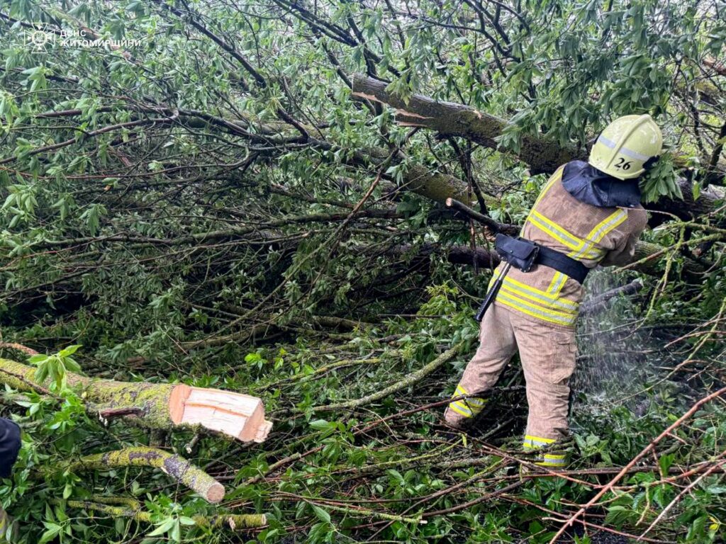 Станом на 21:00 рятувальники вже прибрали 100 дерев, що перекривали дороги, падали на автівки та будівлі. Зокрема, поблизу с. Разіне Романівської громади Житомирського району рятувальники протягом 2,5 годин розрізали та прибирали 25 аварійних дерев. Крім цього, поблизу с. Більківці Коростишівської громади того ж району дерево впало на легковий автомобіль. А у с. Троянів береза впала на дах господарчої будівлі, пошкодила паркан та лінію електропередач.