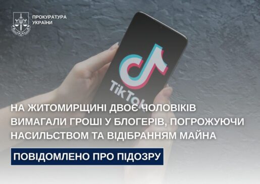За процесуального керівництва Житомирської обласної прокуратури повідомлено про підозру двом чоловікам у вимаганні грошових коштів у блогерів з Коростенського району (ч. 4 ст. 189 КК України).