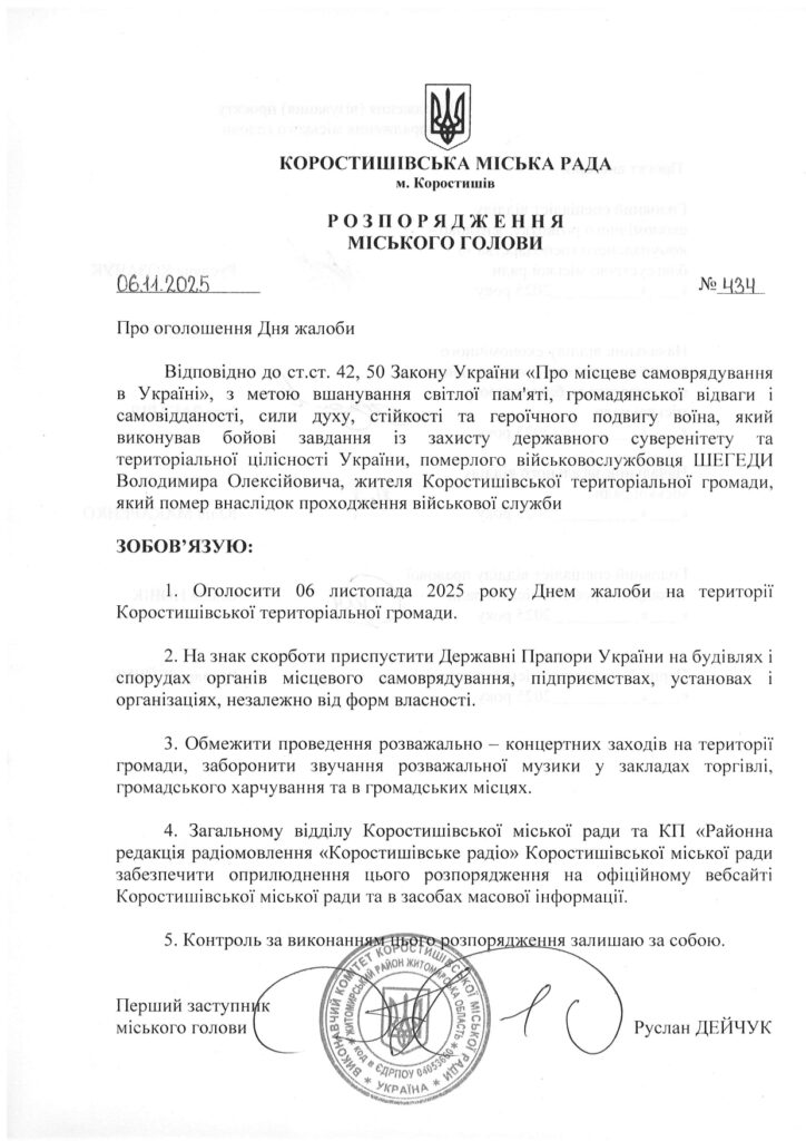 Відповідно розпорядження міського голови  № 434 від 06.11.2025 року, з метою вшанування світлої пам’яті, громадської відваги і самовідданості, сили духу, стійкості та героїчного подвигу воїна, який виконував бойові завдання із захисту державного суверенітету та територіальної цілісності України військовослужбовця ШЕГЕДИ Володимира Олексійовича, жителя Коростишівської територіальної громади, який загинув внаслідок збройної агресії російської федерації проти України,