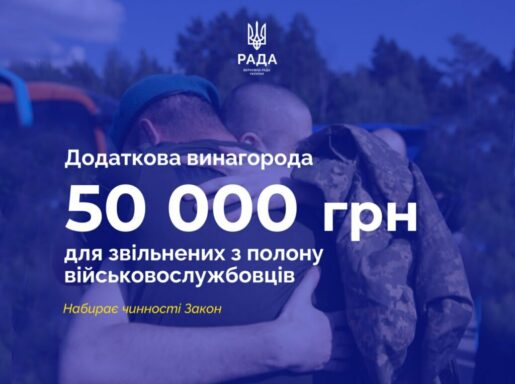 15 листопада набрав чинності закон, який встановлює додаткову винагороду у розмірі 50 000 грн для звільнених з полону військовослужбовців, які перебувають на стаціонарному лікуванні понад 30 днів.