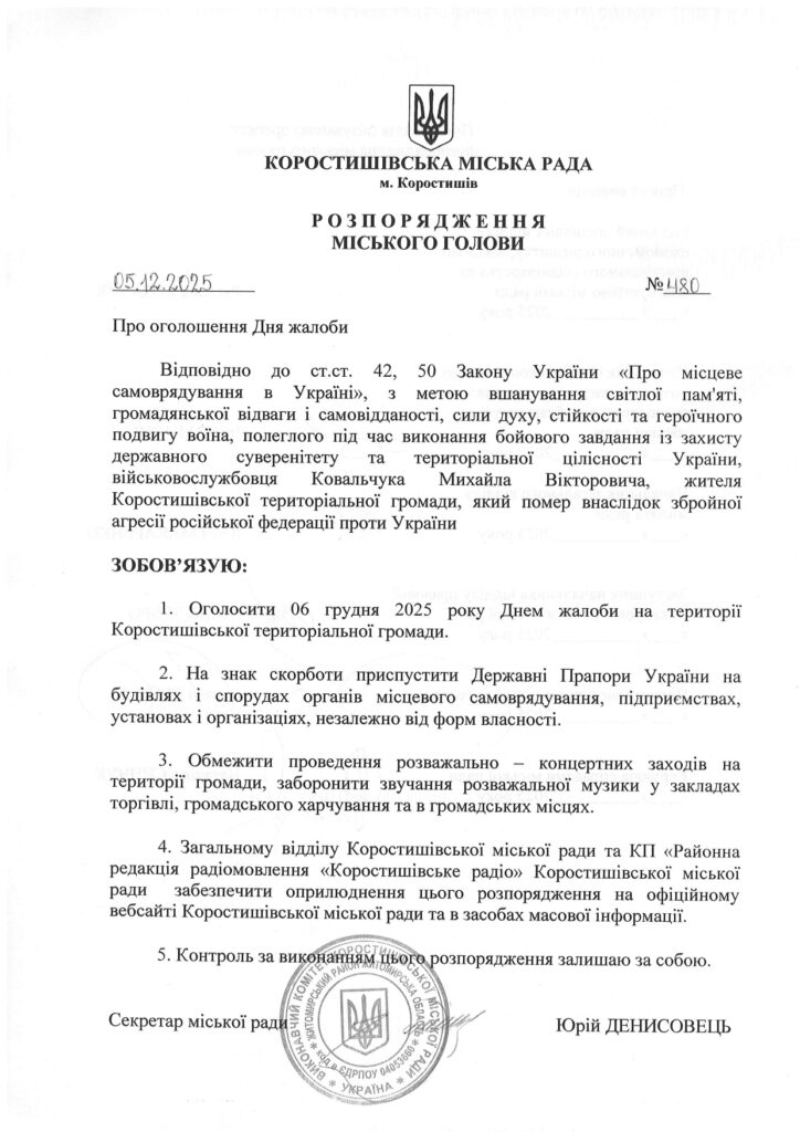Відповідно розпорядження міського голови № 480 від 05.12.2025 року, з метою вшанування світлої пам’яті, громадської відваги і самовідданості, сили духу, стійкості та героїчного подвигу воїна, який виконував бойові завдання із захисту державного суверенітету та територіальної цілісності України військовослужбовця КОВАЛЬЧУКА Михайла Вікторовича, жителя Коростишівської територіальної громади, який загинув внаслідок збройної агресії російської федерації проти України,
