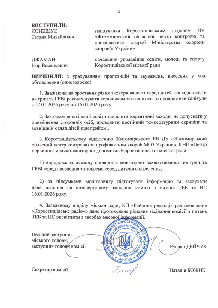 У зв’язку зі зростанням рівня захворюваності на грип та гострі респіраторні вірусні інфекції (ГРВІ) серед дітей у закладах освіти Коростишівської міської ради, на території Коростишівської міської територіальної громади продовжено канікули.