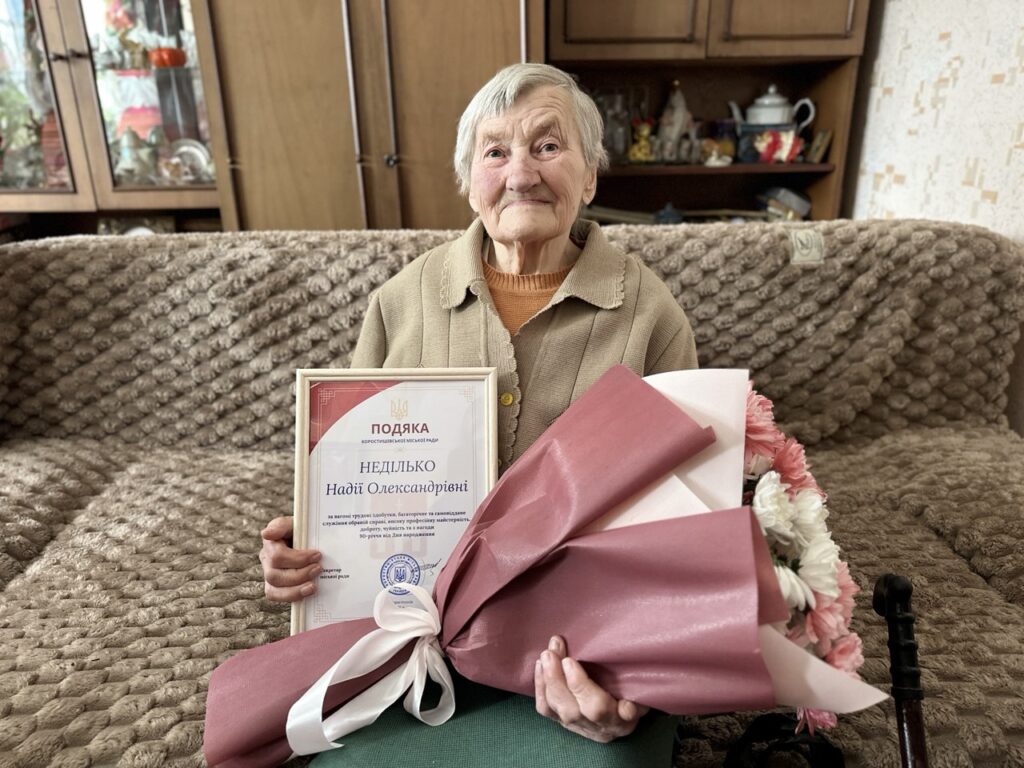 Від імені Коростишівської міської ради та депутатського корпусу вони вручили ювілярці квіти, цінний подарунок і Подяку за вагомі трудові здобутки, багаторічне та самовіддане служіння обраній справі, високу професійну майстерність, доброту й чуйність, а також з нагоди 90-річчя від дня народження. Гості побажали Надії Олександрівні міцного здоров’я, родинного тепла та відзначити ще 100 років і більше у доброму здоров’ї та мирі.