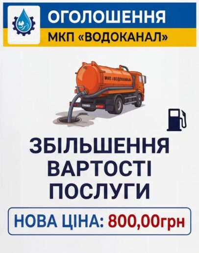 Адміністрація МКП «Водоканал» повідомляє, що з 01.04.2026 року вводиться в дію нова ціна на послугу з вивезення рідких побутових відходів асенізаційною машиною. Збільшення вартості послуги пов’язано зі зростанням основних складових собівартості, а саме: ✅ Значним зростанням цін на пально-мастильні матеріали; ✅ Зростанням витрат на технічне обслуговування спецтехніки. ‼️ Нова ціна за одну послугу (один рейс) становитиме 800,00грн з ПДВ Для отримання детальної інформації та укладання нових договорів звертайтеся за адресою: пров.Назаренка, 6 (у касу підприємства).