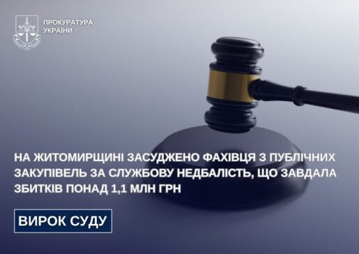 На Житомирщині засуджено фахівця з публічних закупівель за службову недбалість, що завдала збитків понад 1,1 млн грн